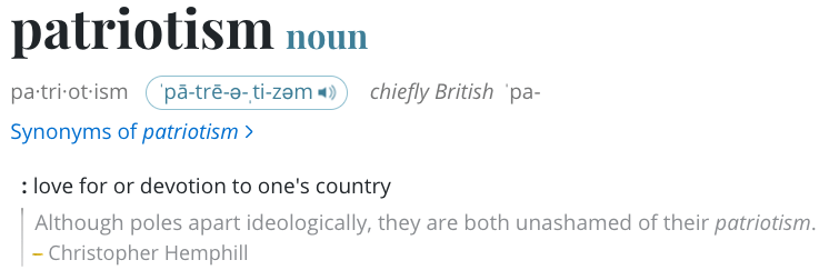 I think Merriam-Webster’s definition leaves out too much nuance. Or, perhaps I am adding too much nuance. I strongly believe that a patriot of the country must also have knowledge and understanding of the country. For example, too many people say they support the 2nd amendment but don’t understand why the founding fathers included it in the Constitution.