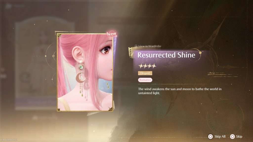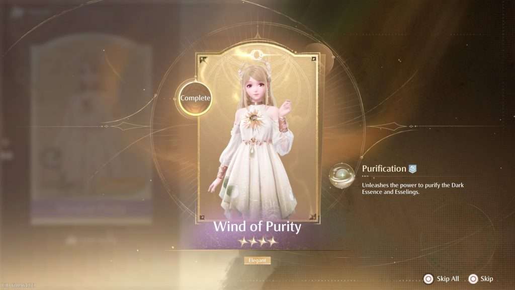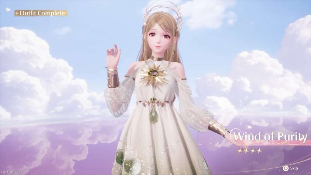 In the screenshot below you can see one of the pieces for the purification dress outfit. This piece says, “The wind awakens the sun and moon to bathe the world in untainted light.”