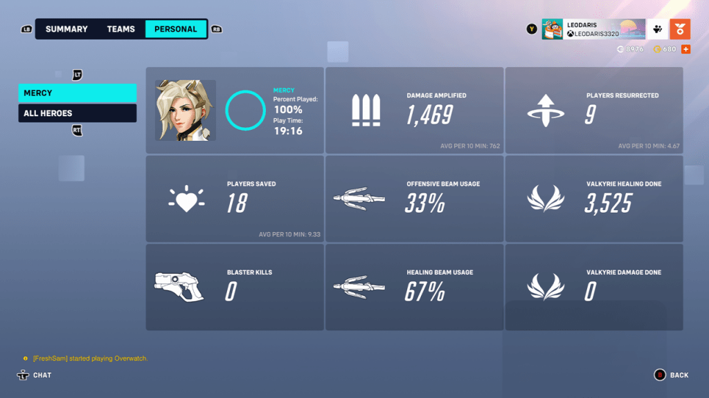 I had a really good match on Overwatch. Even if it was a defeat, I still got over 22,000 healing. Here’s a gallery of the stats for the end of the match. You can click on the photos to enlarge the photos. I’m Leodaris, playing Mercy. Next time, I’ll get the game recording, hopefully.