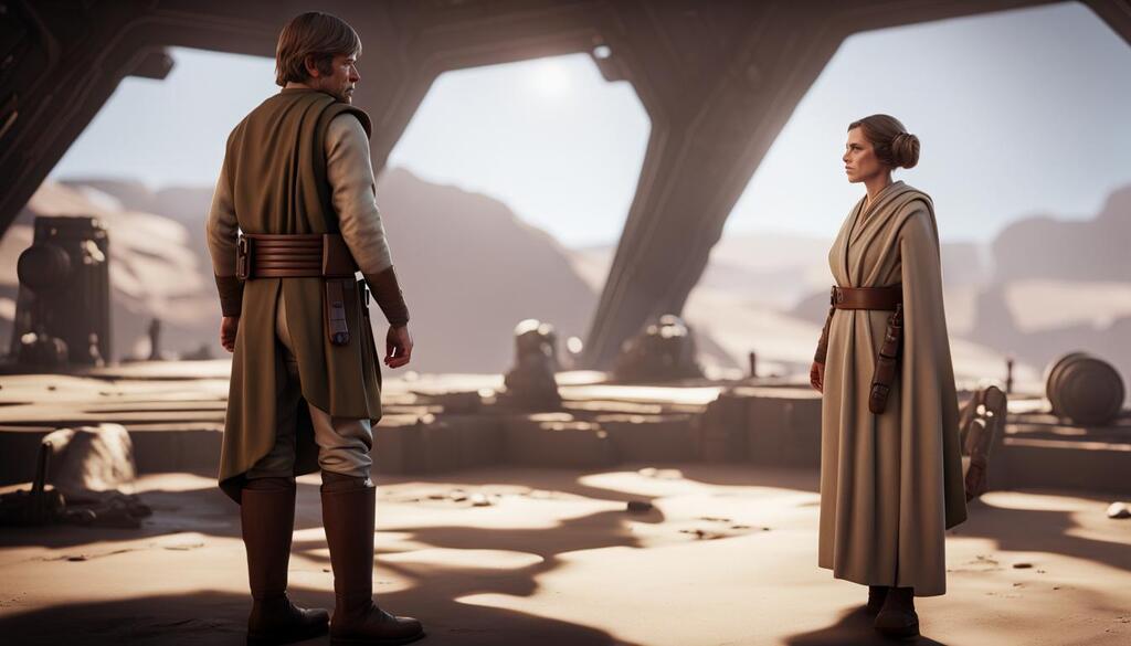 Leia strikes a pose, battledress shimmering in the light. Luke rolls his eyes good-naturedly and exits the room, chuckling to himself.